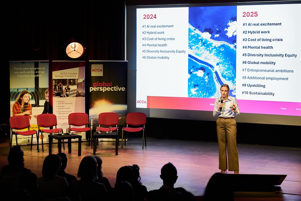 Wydarzenie otworzyła Agnieszka Jarosz, Head of ACCA Northern & Eastern Europe, która przedstawiła aktualności z życia ACCA oraz zapowiedziała zmiany w kwalifikacji ACCA, które wejdą w życie w 2027 roku. Następnie zaprezentowała kluczowe wnioski z badania ACCA Global Talent Trends 2025, obejmujące m.in. wpływ sztucznej inteligencji na zawody finansowe, różnorodność i inkluzywność, oczekiwania wobec pracy hybrydowej, dobrostan psychiczny oraz wyzwania związane z kosztami życia.